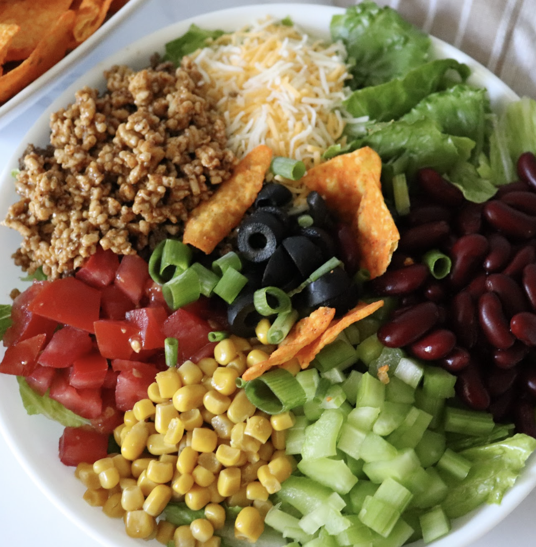 Prepare the rest of the ingredients. Add lettuce, taco meat, beans, and vegetables to a large serving bowl. Pour the sauce and stir carefully to combine.